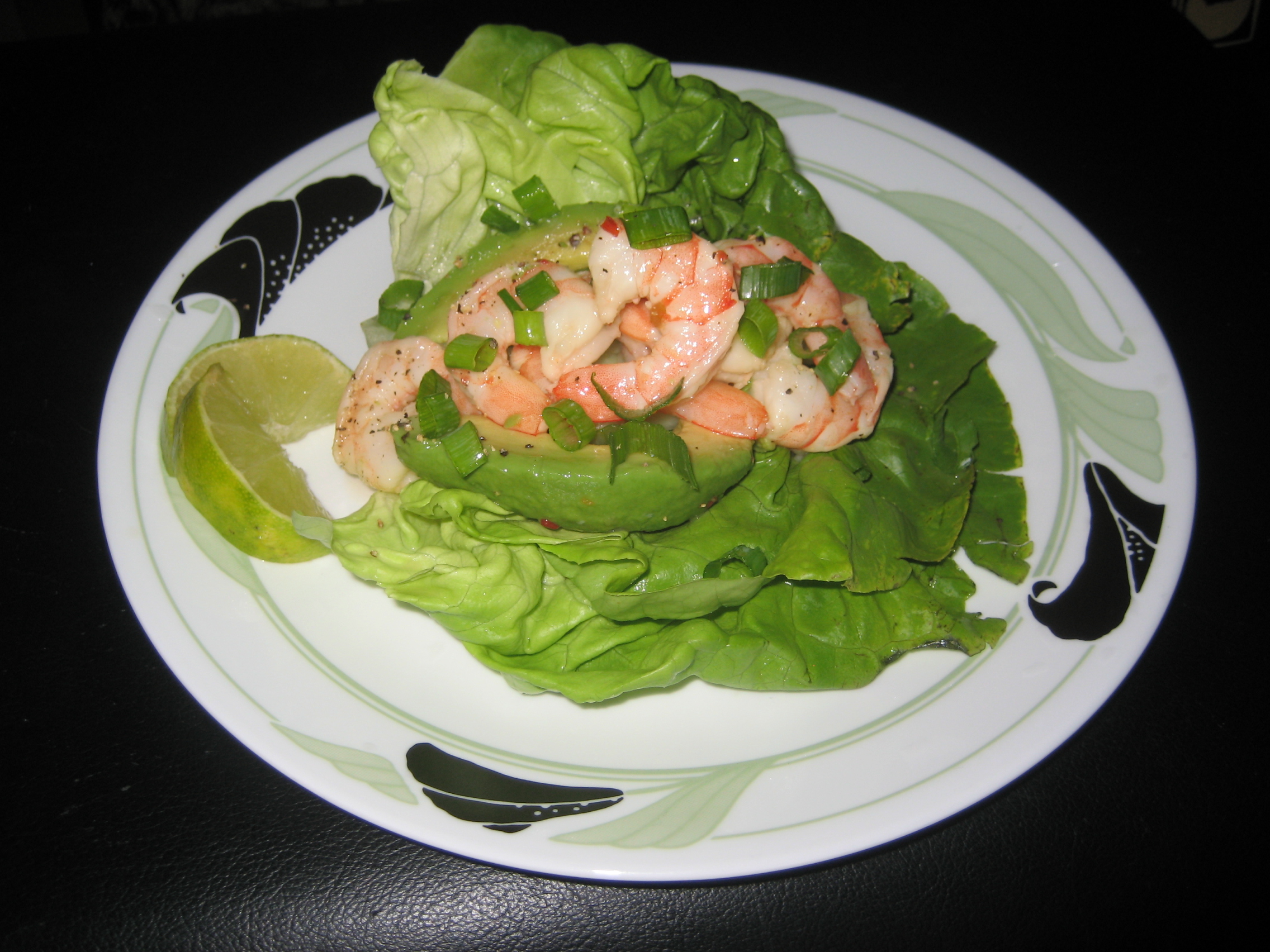 Marinate shrimp in 1/4 cup lime juice and Thai Garlic Chili sauce for at least two hours. Soak avocado slices in the other 1/4 cup of lime juice. Stack two lettuce leaves together and layer six shrimp, two slices of avocado, and four sticks of cucumber. Sprinkle with slices of green onion. Salt and pepper to taste. Makes 4 lettuce wraps.